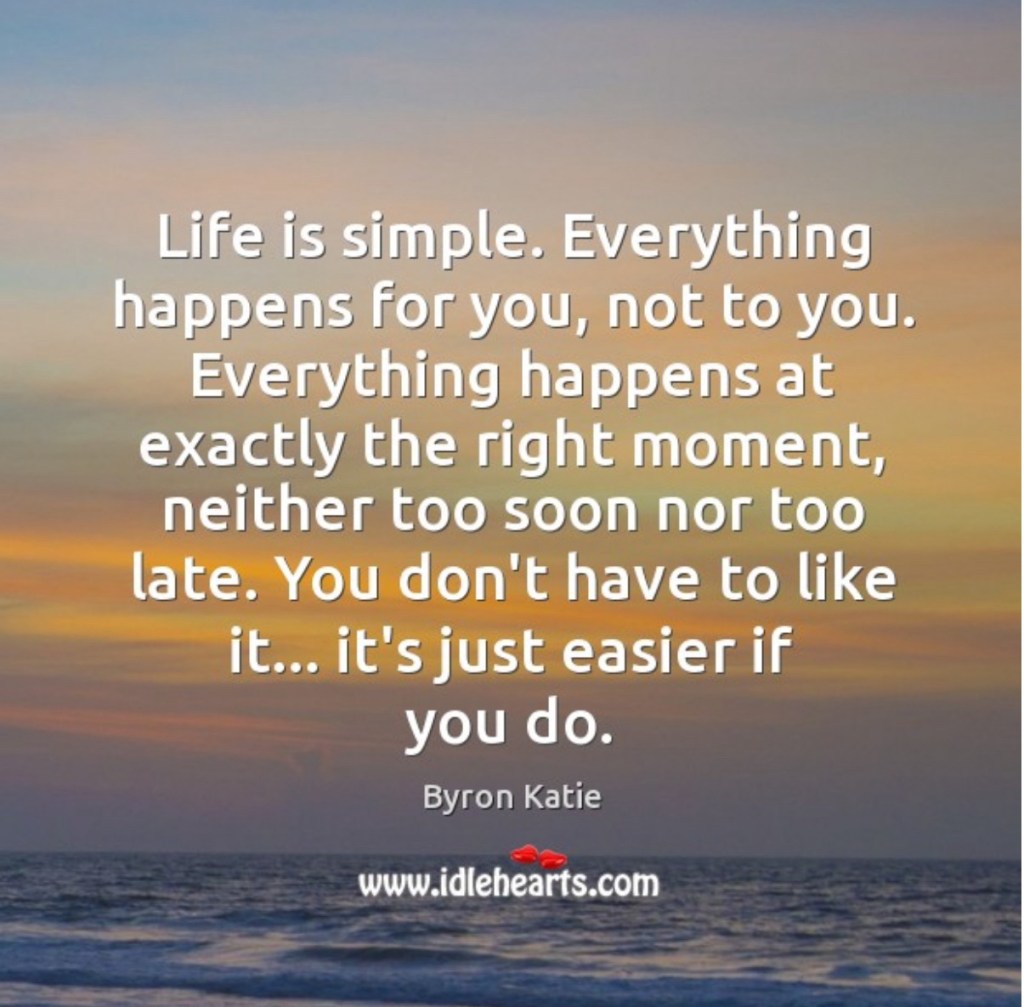 “Life is simple. Everything happens for you, not to you. Everything happens at exactly the right moment, neither too soon nor too late. You don’t have to like it… it’s just easier if you do.” — Byron Katie