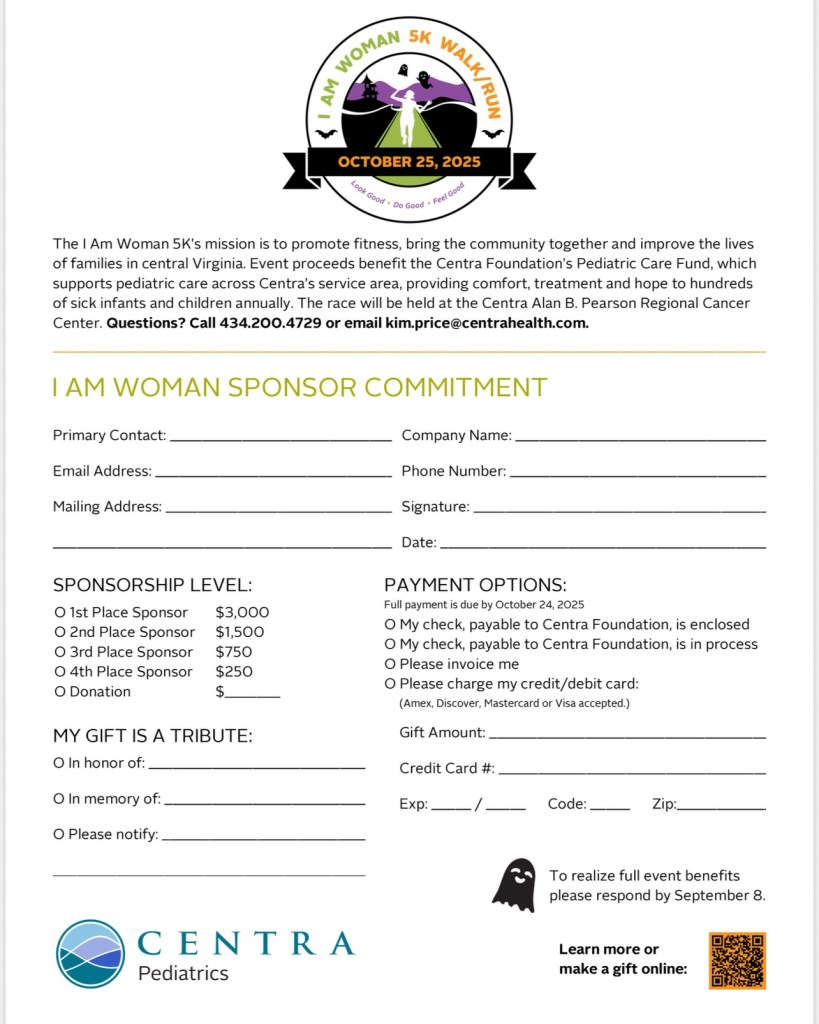 Sponsorships are available for the annual “I Am Woman 5K/Walk” which promotes fitness, brings the community together and improves the lives of families in central Virginia.