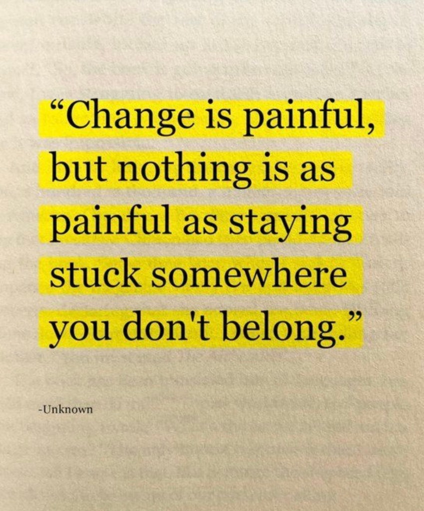 Growth often requires the uncomfortable shedding of old versions of ourselves. We frequently cling to the familiar, fearing the unknown, but we must remember: Change is painful, but nothing is as painful as staying stuck somewhere you don’t belong.